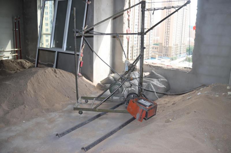 经现场勘验,发生事故设备为春雨牌便携式吊运机(以下简称:吊运机),由山西实普瑞吊运机制造有限公司生产,主要结构由上下斜杆、平杆、立杆、底座及主机等组成;事故发生后吊运机位于项目S-3门店9层窗口处脱离轨道放置,窗框被拆除,窗口边沿无防护栏杆等安全保护措施,配重水泥散落在窗口内侧地面(见图一)。